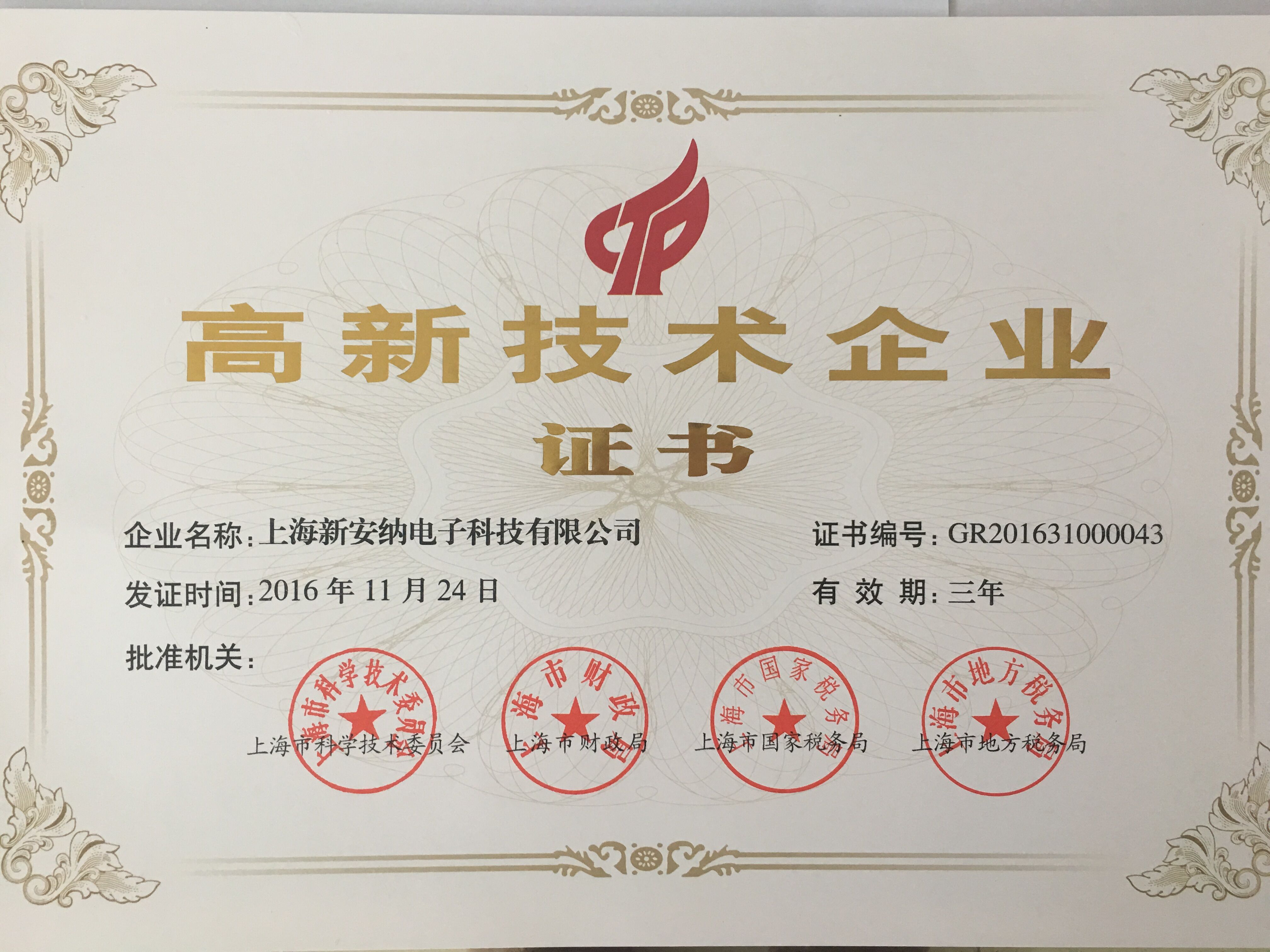 2016.11.24 熱烈祝賀新安納公司榮獲“上海市高新技術企業”稱號